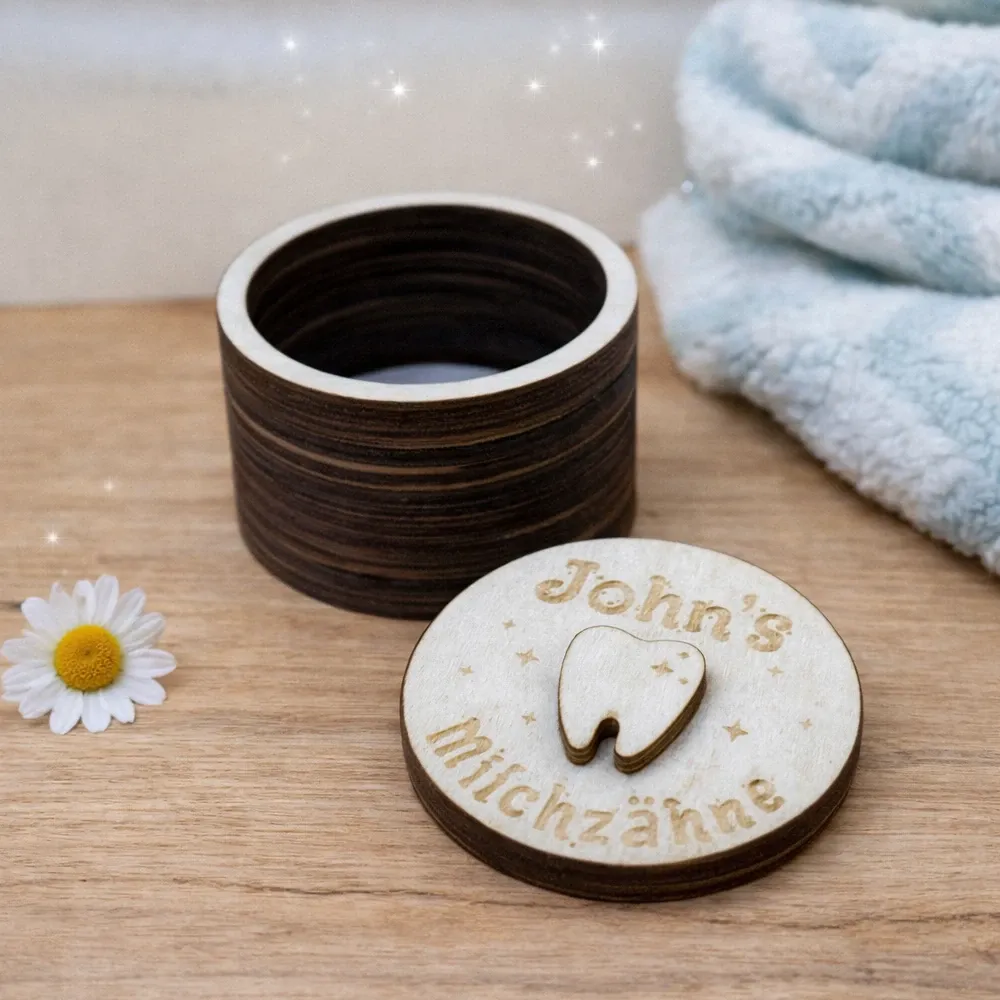 Das Döschen wird aus hochwertigem Holz gefertigt und präzise gelasert und graviert. Der Deckel schließt passgenau und ist mit einem niedlichen Zahnmotiv sowie einem Namen oder Text versehen.
