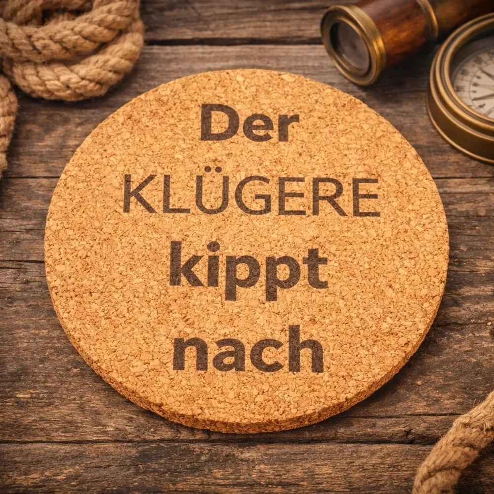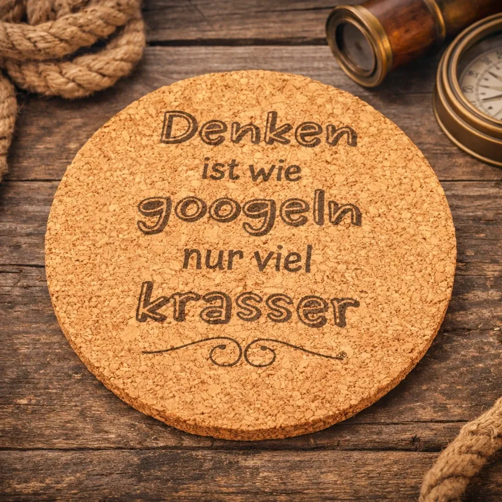 Unsere gravierten Korkuntersetzer verbinden natürliche Optik mit Humor und Persönlichkeit.
