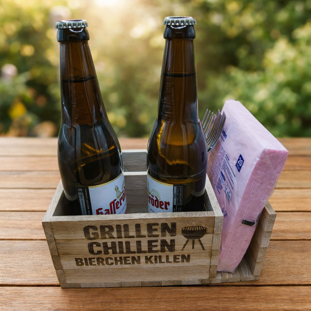 Die Vorderseite kann mit einer Lasergravur versehen werden – zum Beispiel mit dem beliebten Spruch: „Grillen – Chillen – Bierchen killen“