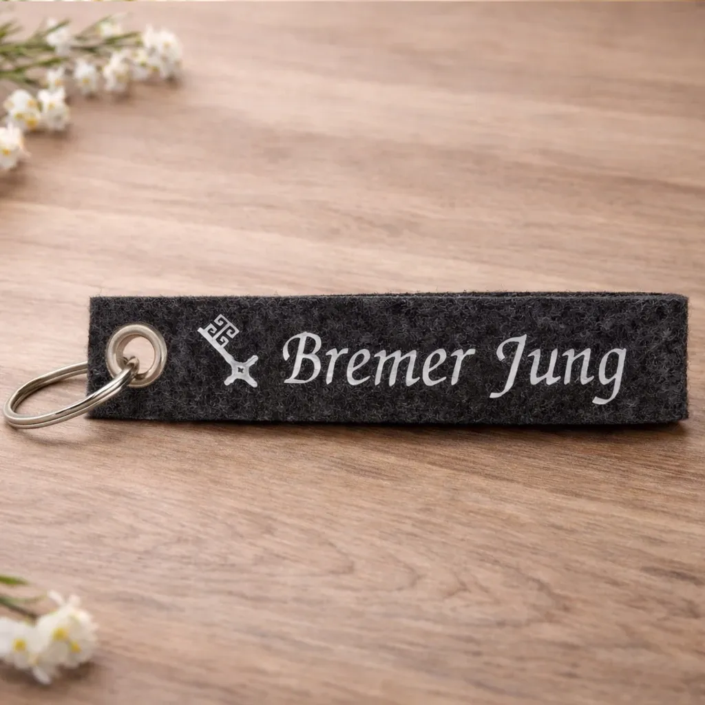 Dieser personalisierte Filz-Schlüsselanhänger ist ein schlichtes, zeitloses Accessoire für Alltag, Beruf und Freizeit.