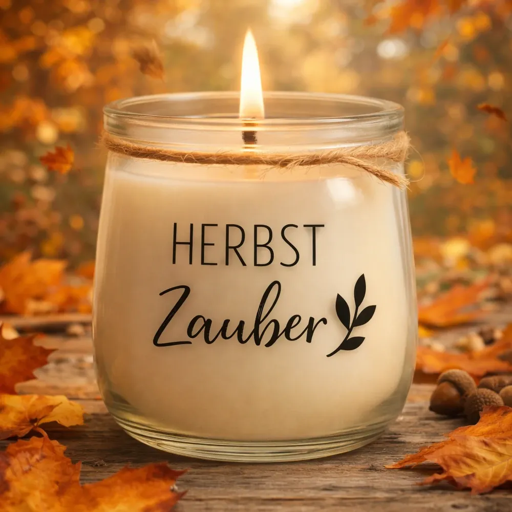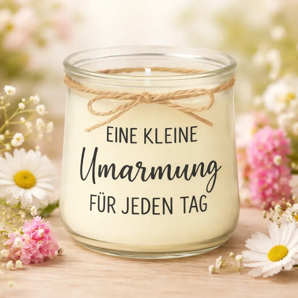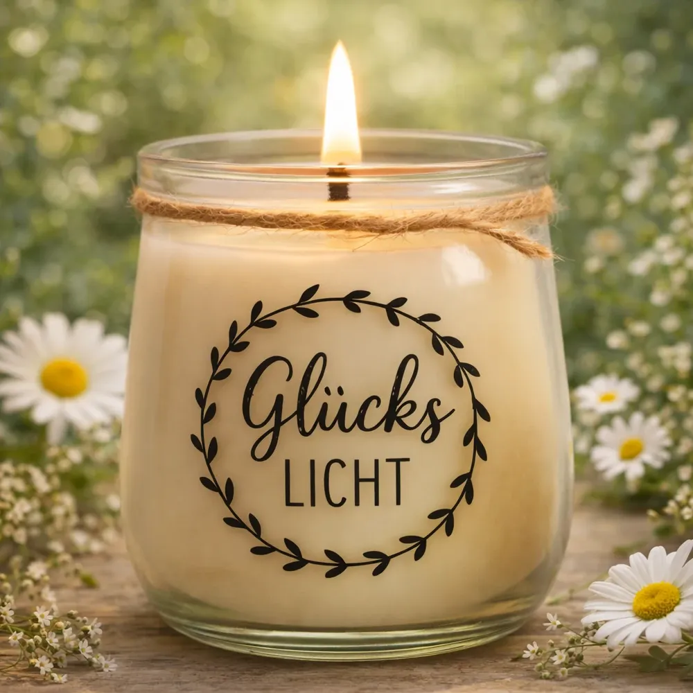Handgegossene Kerze im Glas – mit liebevollem Spruch beplottet