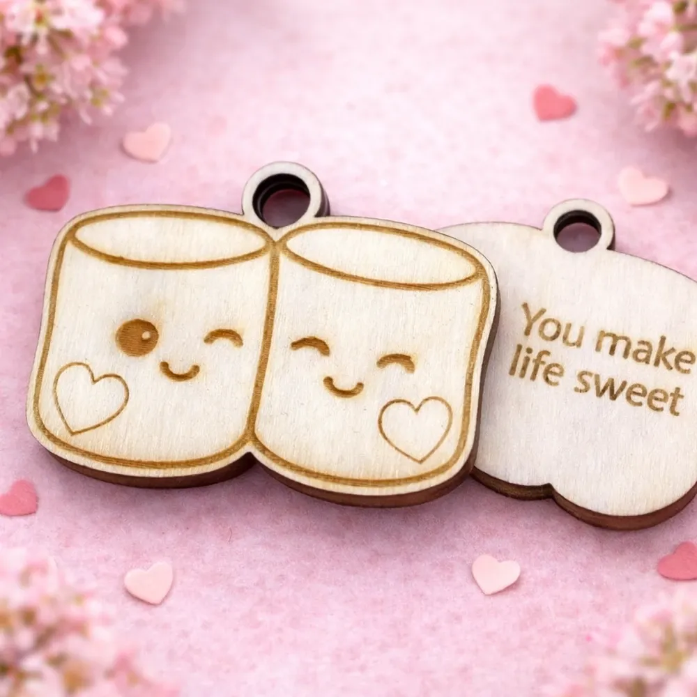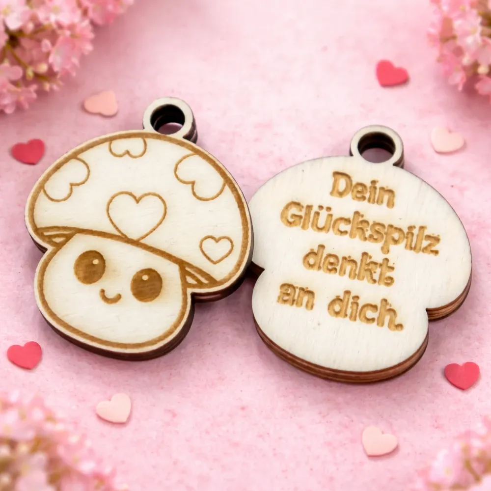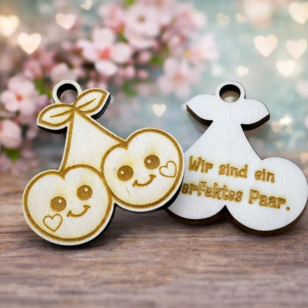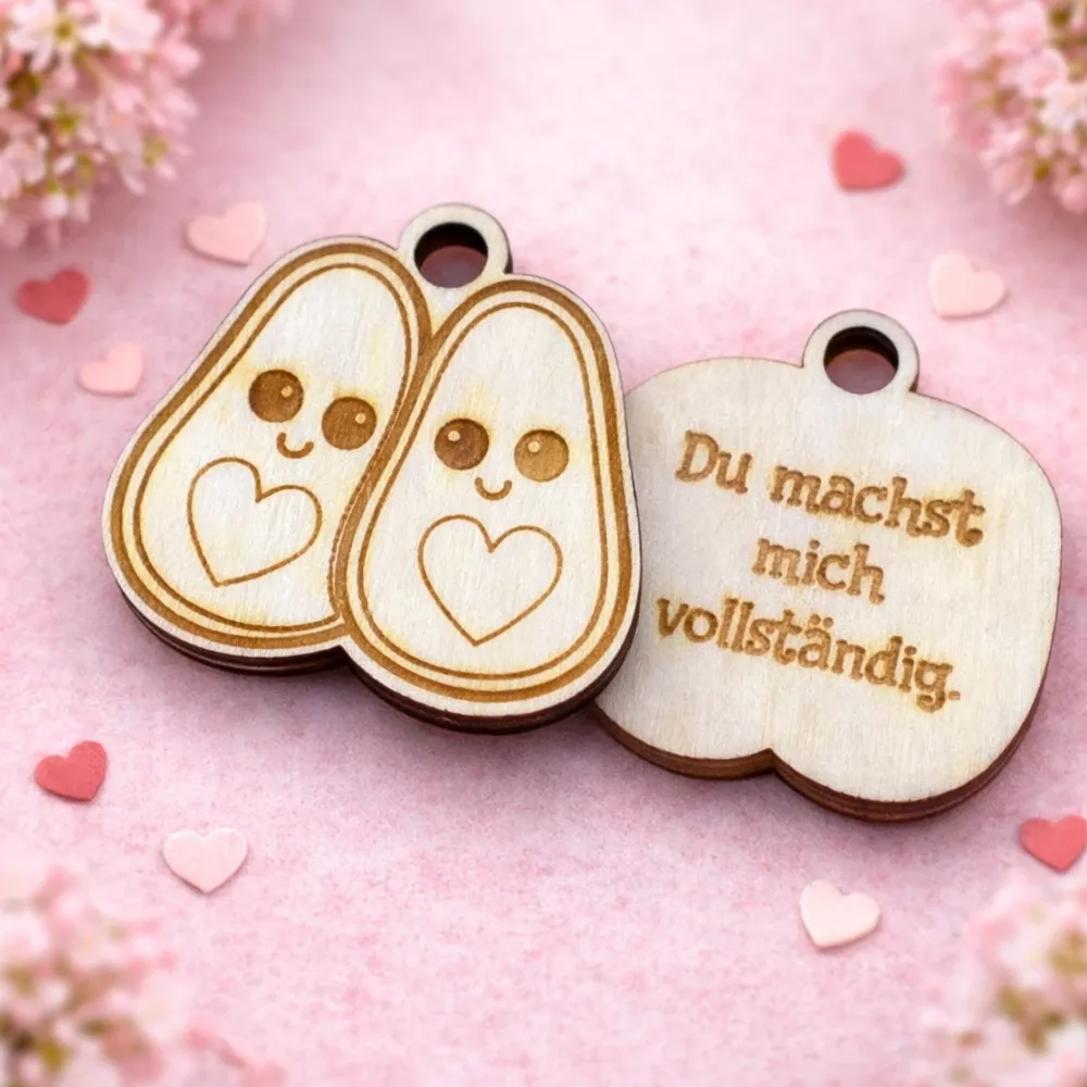 Jeder Anhänger wird aus hochwertigem, natürlich gemasertem Holz gefertigt und mit feinen Illustrationen sowie liebevollen Sprüchen graviert. Die warme Holzstruktur macht jedes Stück zu einem echten Unikat – kein Anhänger gleicht dem anderen.