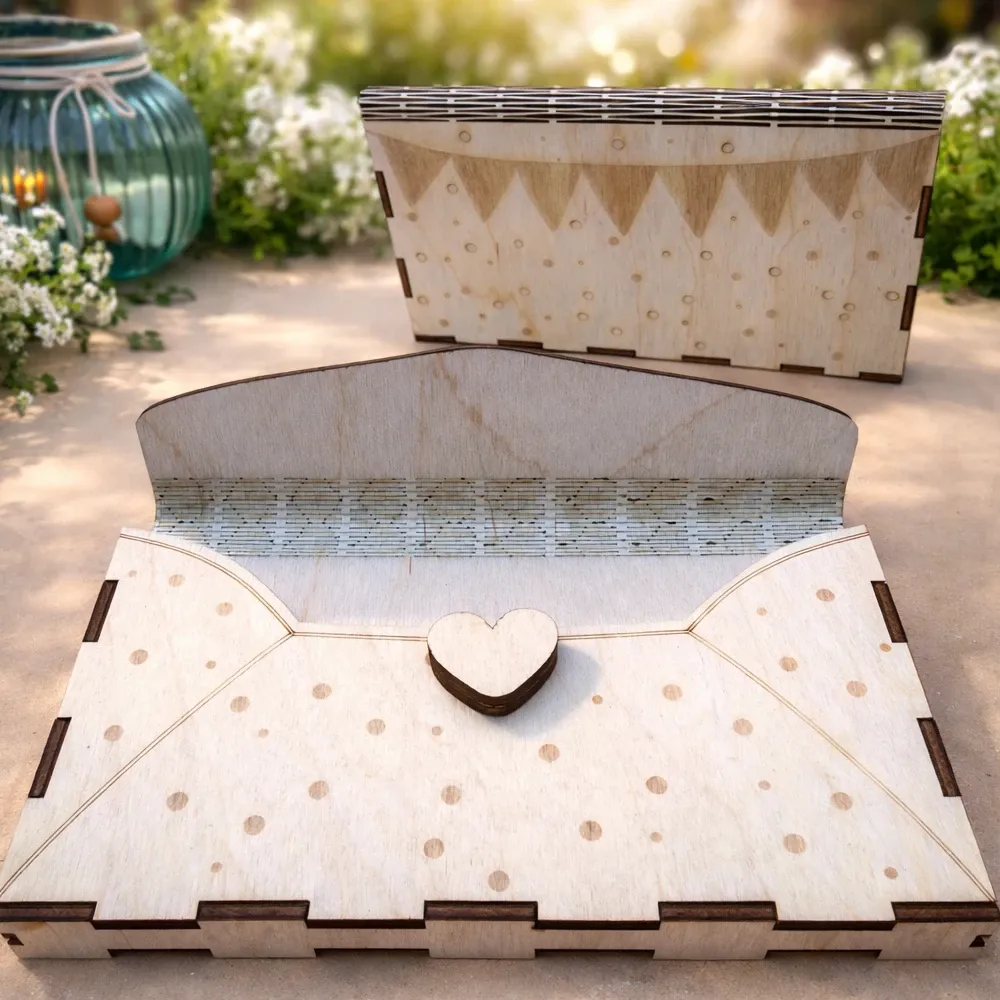 Aus hochwertigem Holz präzise gelasert und graviert, eignet er sich perfekt als stilvolle Verpackung für Geldgeschenke, Gutscheine oder kleine Botschaften.