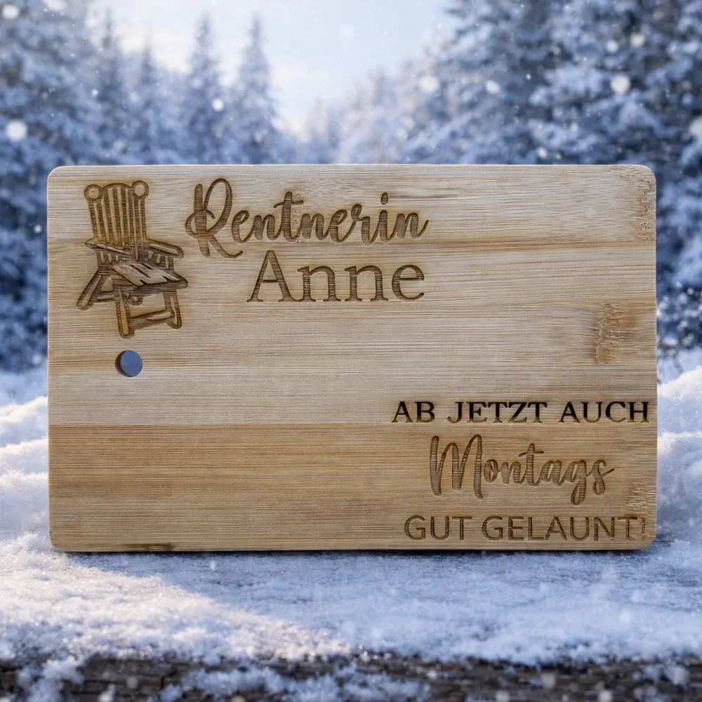 Dieses liebevoll gestaltete Frühstücksbrett aus Bambusholz ist ein ganz besonderes Geschenk für Rentnerinnen, humorvoll, persönlich und alltagstauglich.