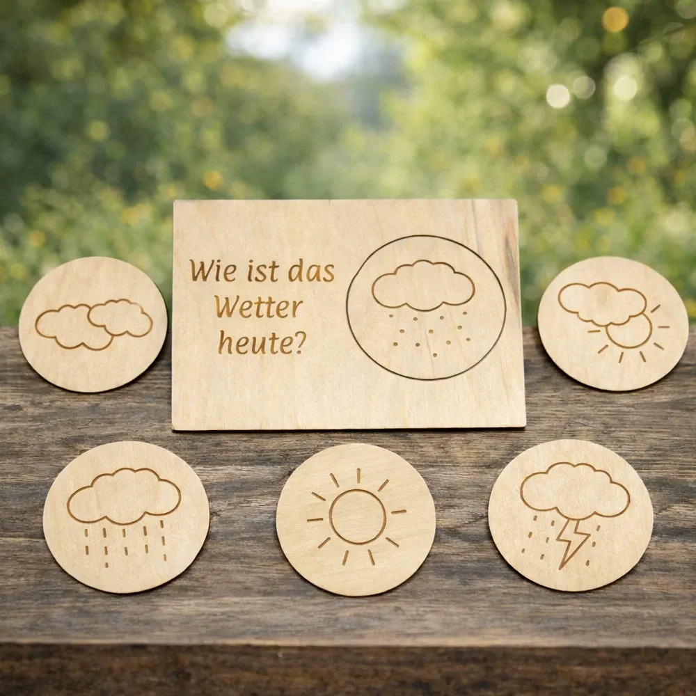 Alle Elemente werden präzise aus Birkenholz gelasert und graviert. Die natürliche Holzmaserung macht jedes Set zu einem kleinen Unikat. Durch die klaren Symbole ist die Wetteranzeige ideal für den Einsatz in Kita, Grundschule oder Zuhause geeignet.